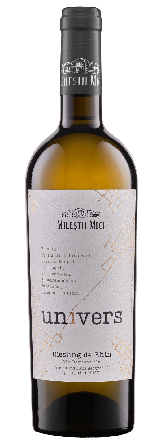 Riesling de Rhin 2021 - vin sec alb cu Indicația Geografică Protejată ”Codru”, produs din struguri de soiul Riesling crescuți în viile ÎS CVC ”Mileștii Mici”. Un vin elegant și nobil, cu o culoare galben-pai și reflexii lejer verzui. Buchetul este complex, cu arome de flori de salcîm, citrice proaspete, lime, cu o mineralitate specifică soiului. Gustul este echilibrat și delicat, făcînd-ul un partener minunat pentru fructele de mare, pește copt, sashimi și snack-uri.